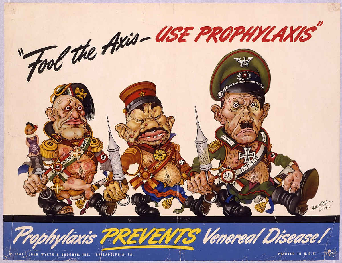 Amerikanisches Propagandaplakat im Zweiten Weltkrieg, das für die Verwendung von Prophylaktika wirbt, indem es groteske Karikaturen des italienischen Faschistenführers Benito Mussolini, des japanischen Generals und Ministerpräsidenten Hideki Tojo und des deutschen Naziführers Adolf Hitler zeigt, die jeweils eine Geschlechtskrankheit darstellen.